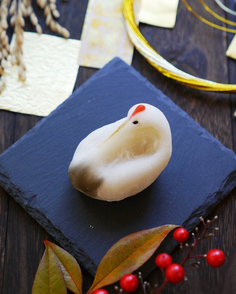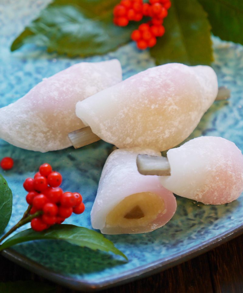 柔らかな求肥餅でお雑煮を見立てた白味噌餡と甘露煮牛蒡を挟んだ
